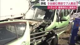 国道1号で9台が関連する事故 7人を救急搬送 信号待ちの車列に大型トラックが追突