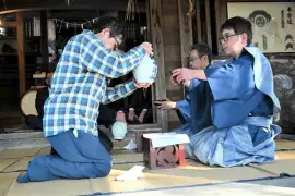 宮崎・日向の「幸福神社」でどんど焼き 餅を食べ、無病息災願う